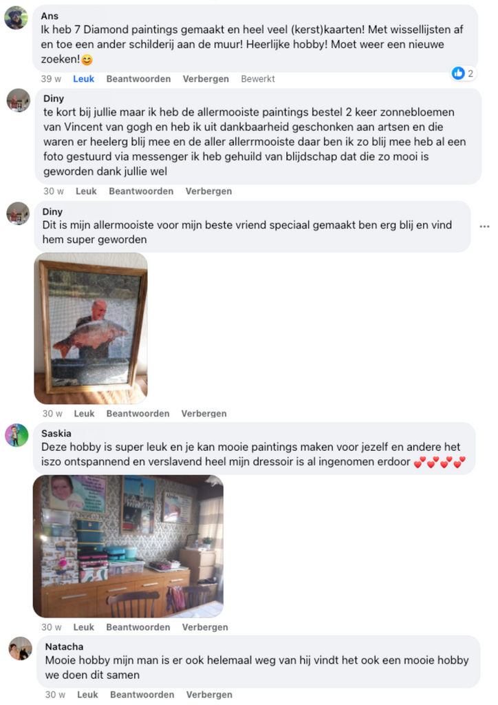 Word lid van onze creatieve fan community op Facebook https://www.facebook.com/happypaintingnl en wissel ideeën met ons uit over Diamond Painting, nieuwe diamond paintings en kunst in het dagelijks leven. Hieronder vind je een kort overzicht van wat onze klanten van ons vinden: